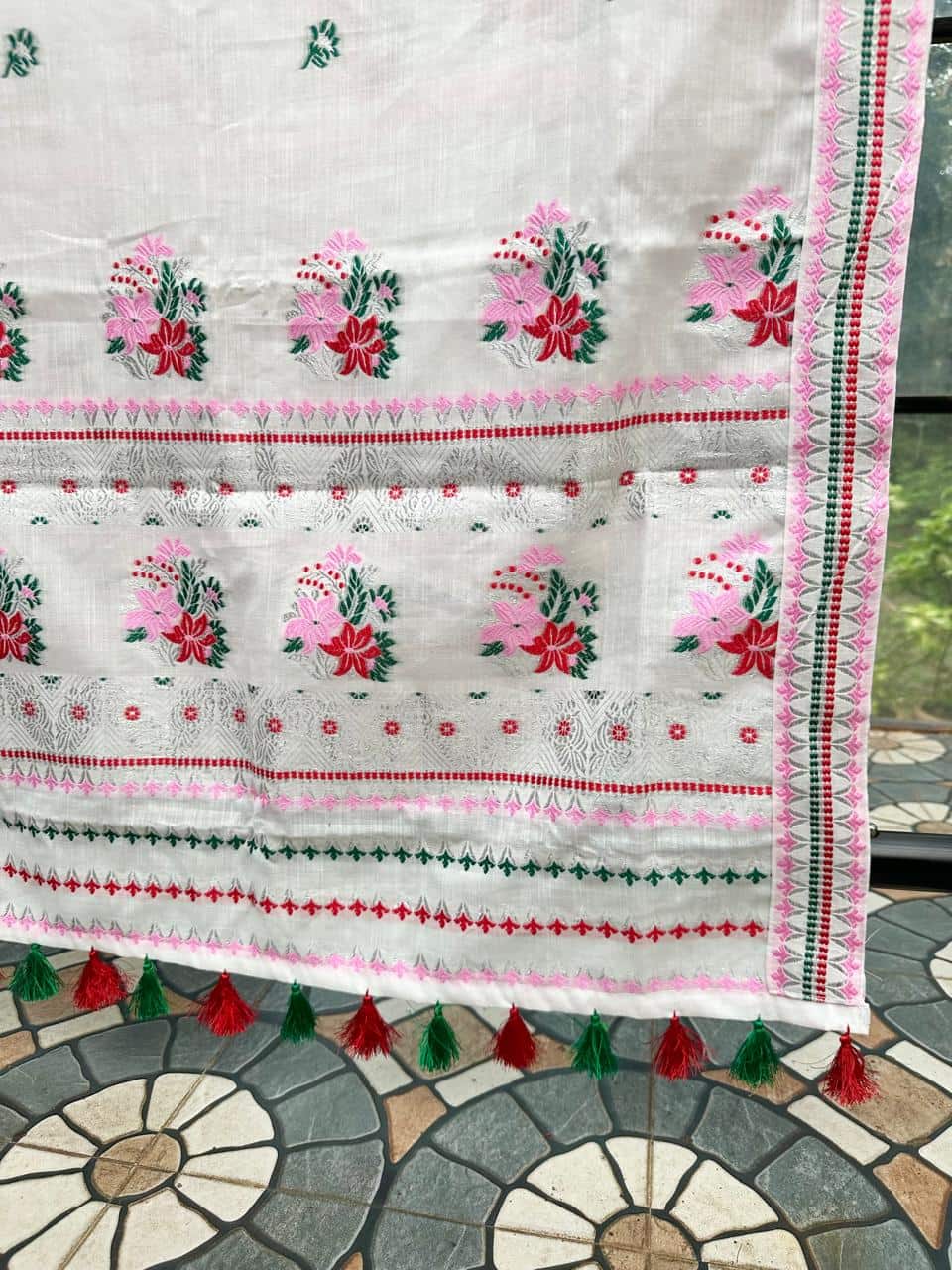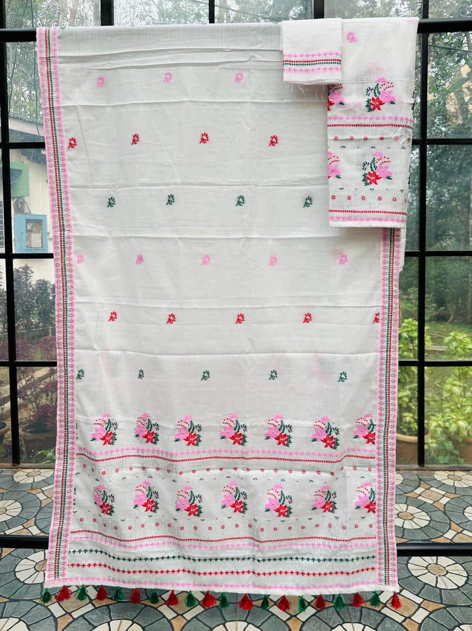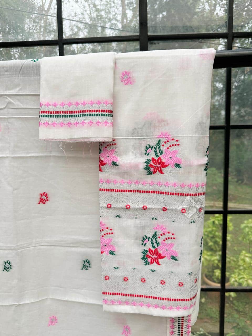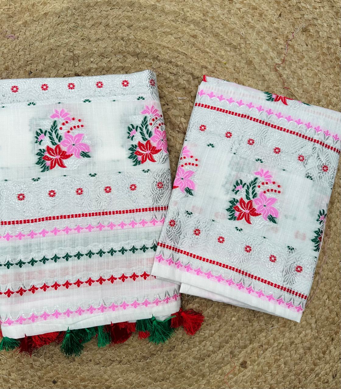 Ready-to-wear mekhela sador designed for effortless elegance and everyday ease, this piece blends comfort with a refined, premium appeal. Crafted from soft, high-quality cotton in soothing pastel tones with a graceful white base, it feels light and breathable—perfect for spring and the upcoming summer season. The highlight lies in its delicate silver thread detailing along the borders, adding a subtle sheen that elevates the entire look with understated sophistication. Versatile enough for festive occasions as well as office wear, and paired with an unstitched blouse piece for flexible styling, this ensemble is made for the modern woman who values both elegance and convenience.