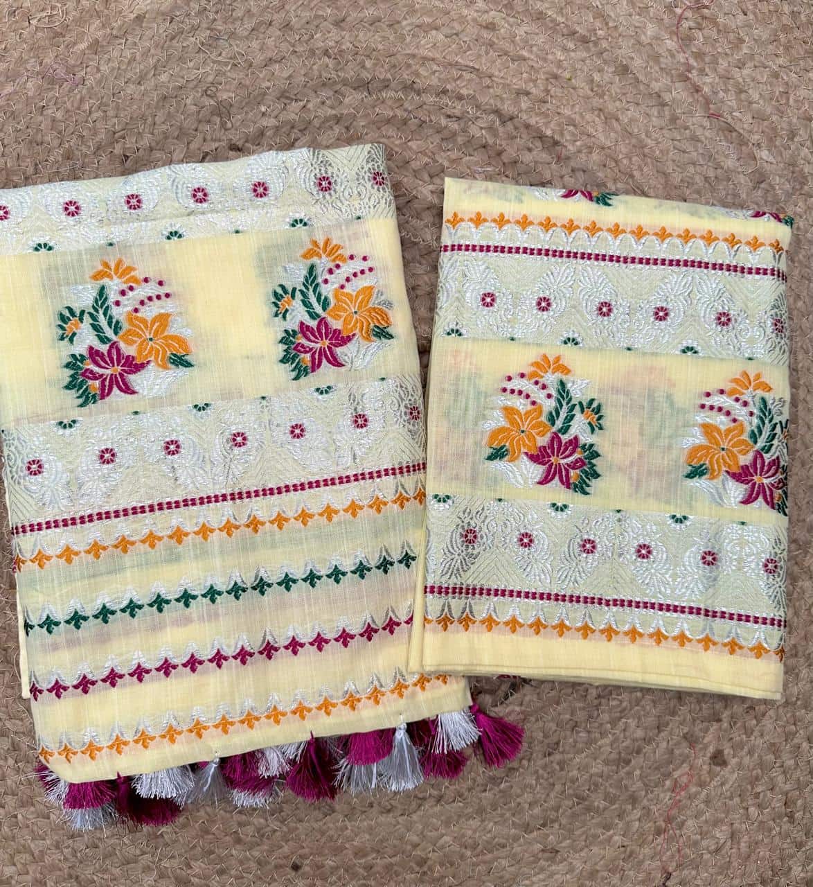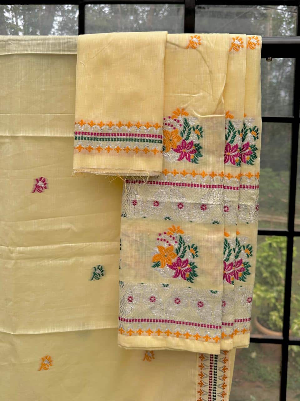 Ready-to-wear mekhela sador designed for effortless elegance and everyday ease, this piece blends comfort with a refined, premium appeal. Crafted from soft, high-quality cotton in soothing pastel tones with a graceful white base, it feels light and breathable—perfect for spring and the upcoming summer season. The highlight lies in its delicate silver thread detailing along the borders, adding a subtle sheen that elevates the entire look with understated sophistication. Versatile enough for festive occasions as well as office wear, and paired with an unstitched blouse piece for flexible styling, this ensemble is made for the modern woman who values both elegance and convenience.