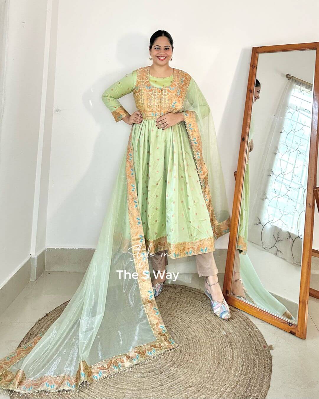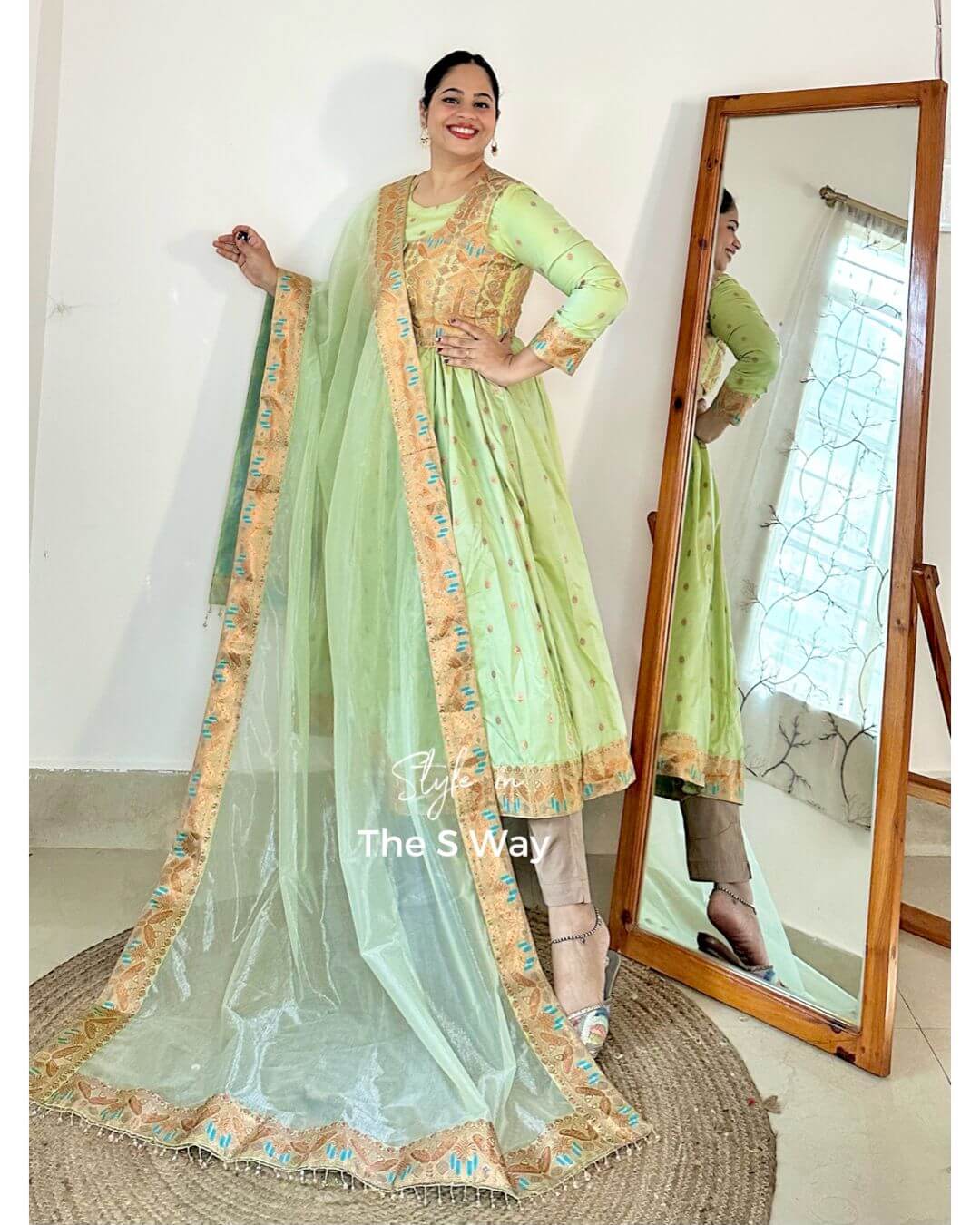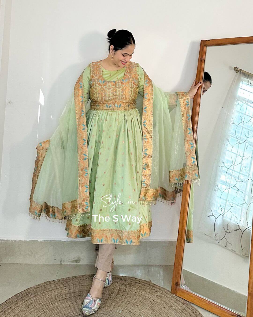 This Royal Regal Anarkali Kurta Set features a stunning detachable half jacket, which can also be styled separately as a blouse. Crafted from Banarasi zari brocade in lyocell, the ensemble delivers richness with fluid comfort. It is paired with a heavily embellished premium net dupatta for a grand, wedding-ready look. Pants not included.