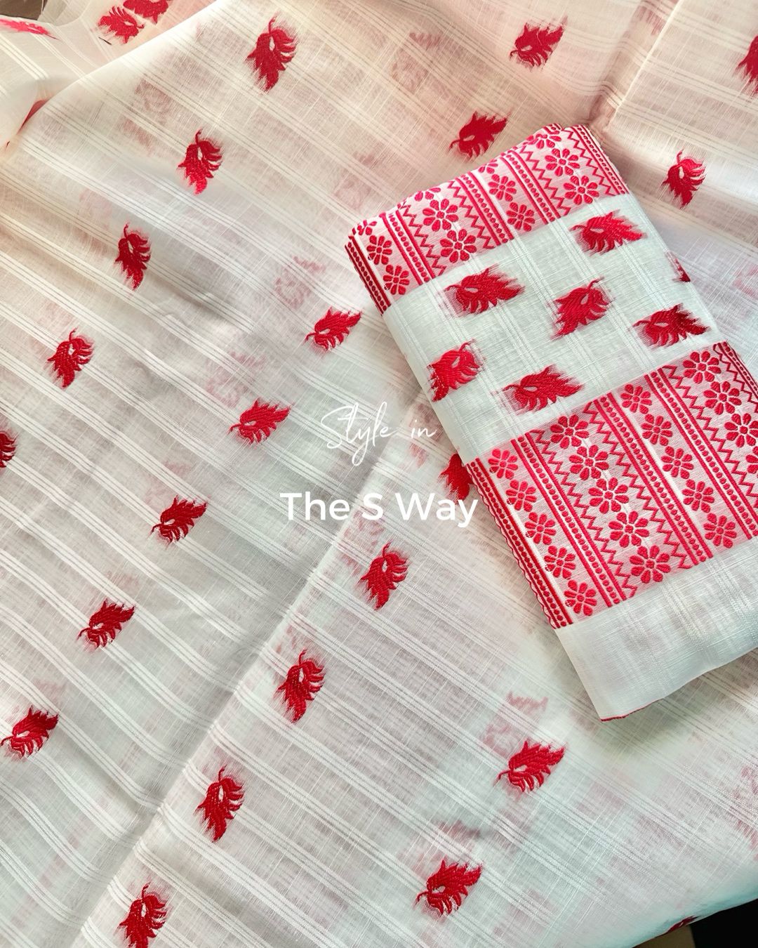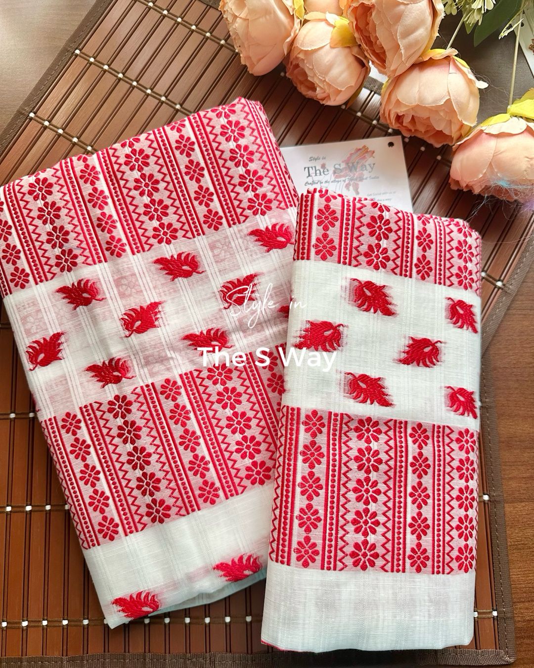 Pure cotton set with Gadi Dia weaving, featuring a beautiful traditional border and elegant Paat buta on the body. Ready to wear with dohi and mekhela stitched. Includes sador, mekhela, and blouse piece (unstitched). A perfect blend of tradition and comfort.