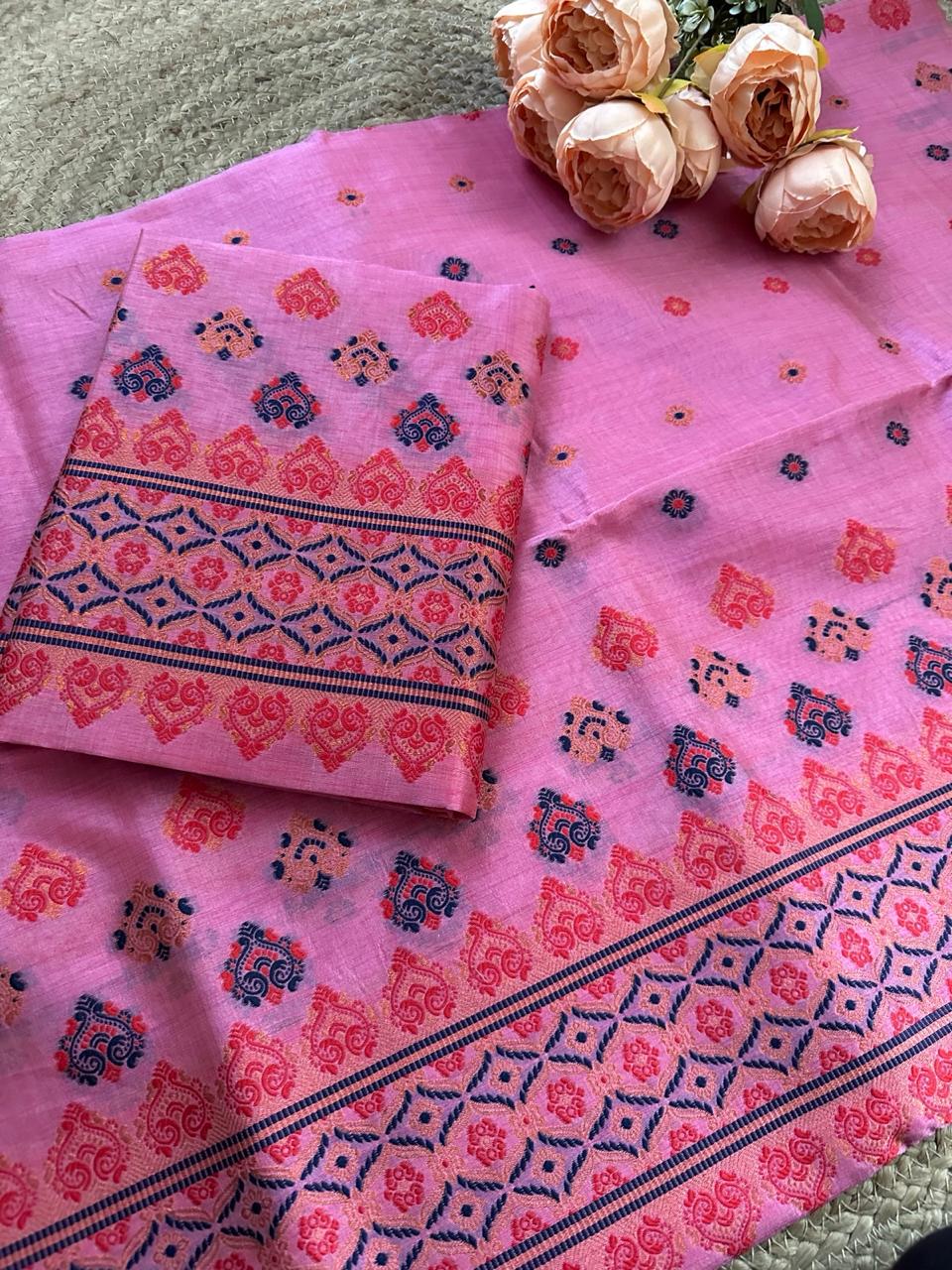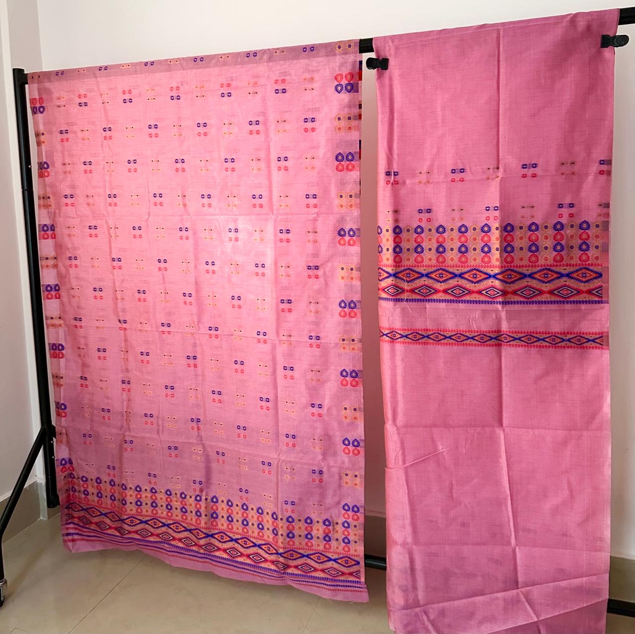 This is our gorgeous Ready to Wear set. Khadi cotton woven on Bafta Tussar with multicoloured Dima-inspired Bargi motifs. The unique blend of cotton and tussar gives a textured yet soft feel, while the vibrant motifs add cultural richness. Perfect for an elegant yet understated look. The blouse piece included is Unstitched.