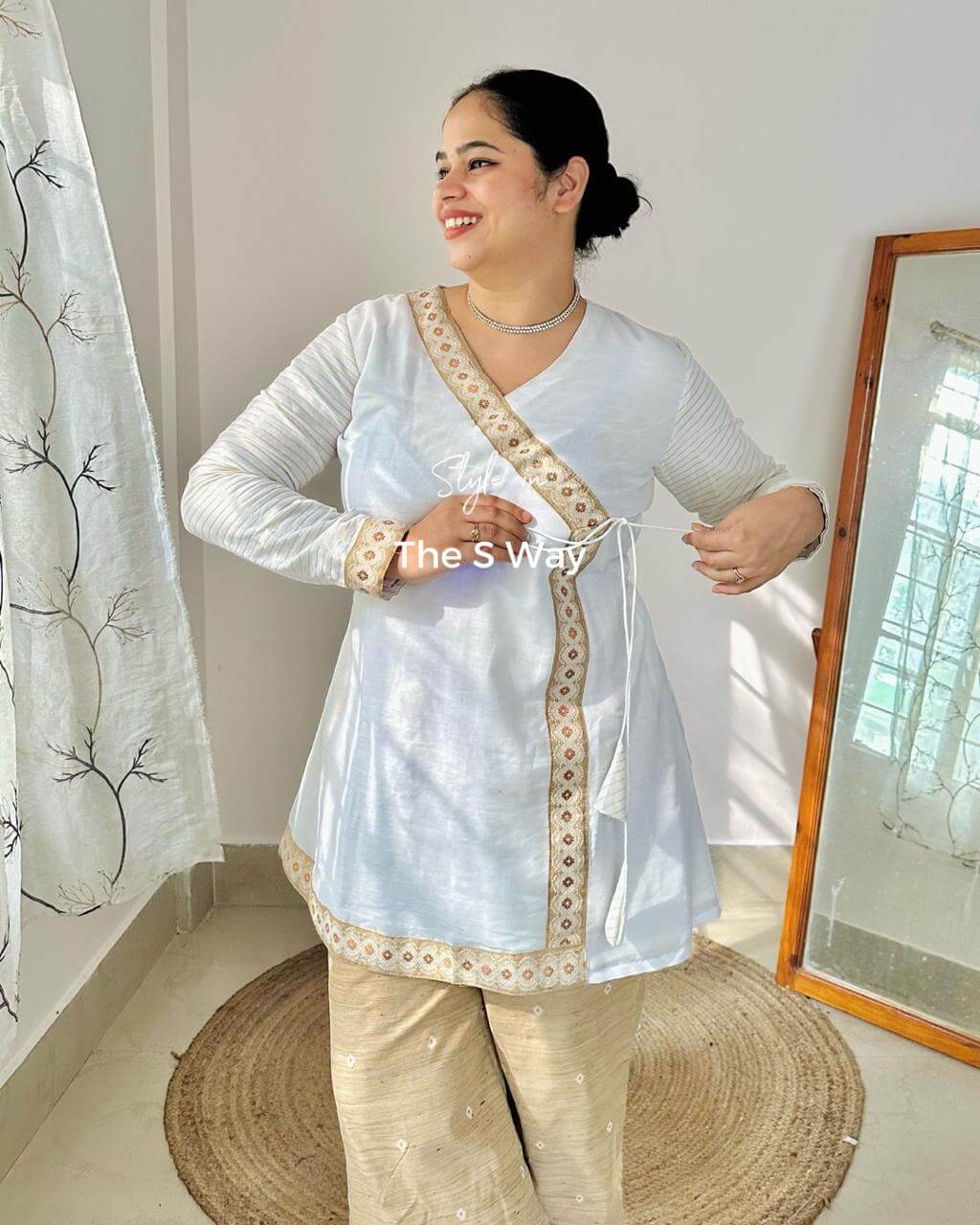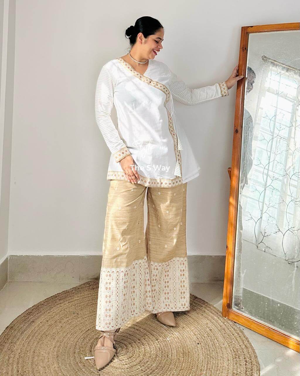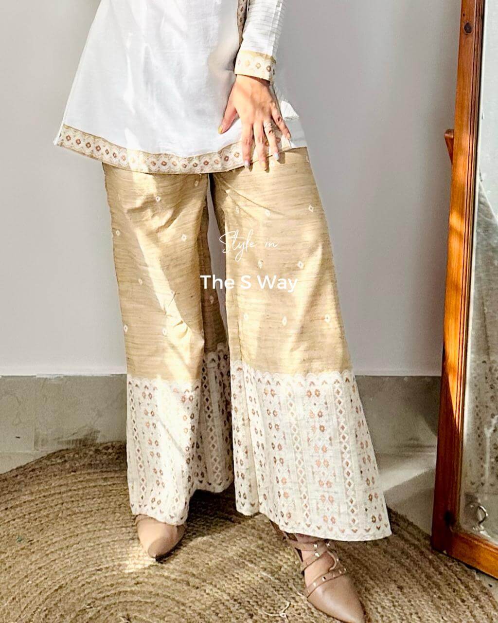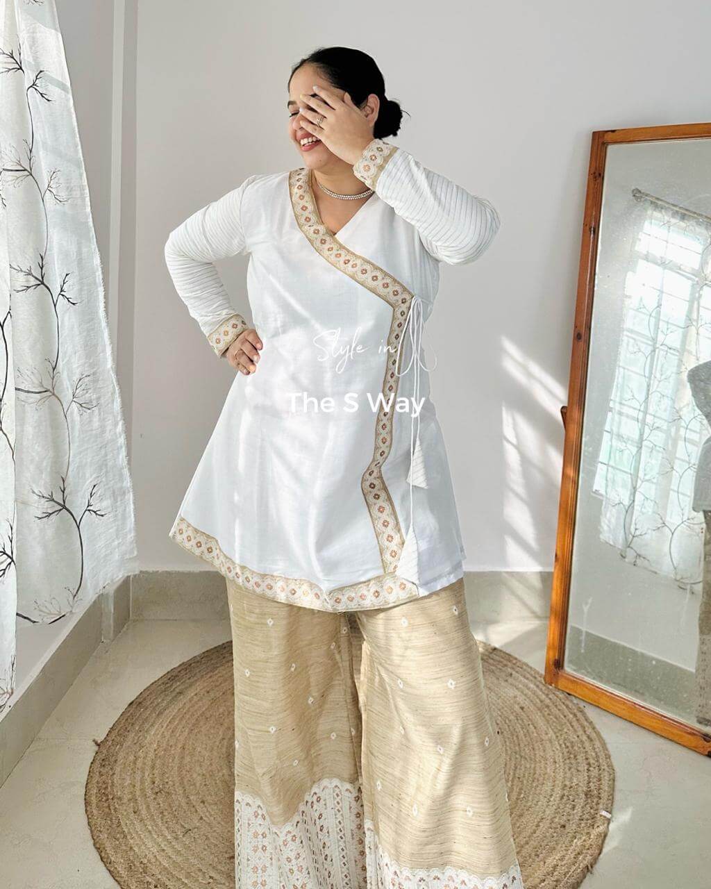 This elegant set pairs a Ghisa sharara pant featuring traditional off-white woven motifs with a handloom white cotton short kurta. The soft, breathable fabric and artisanal detailing make it perfect for festive, semi-ethnic, and everyday elegant styling. Free shipping included.