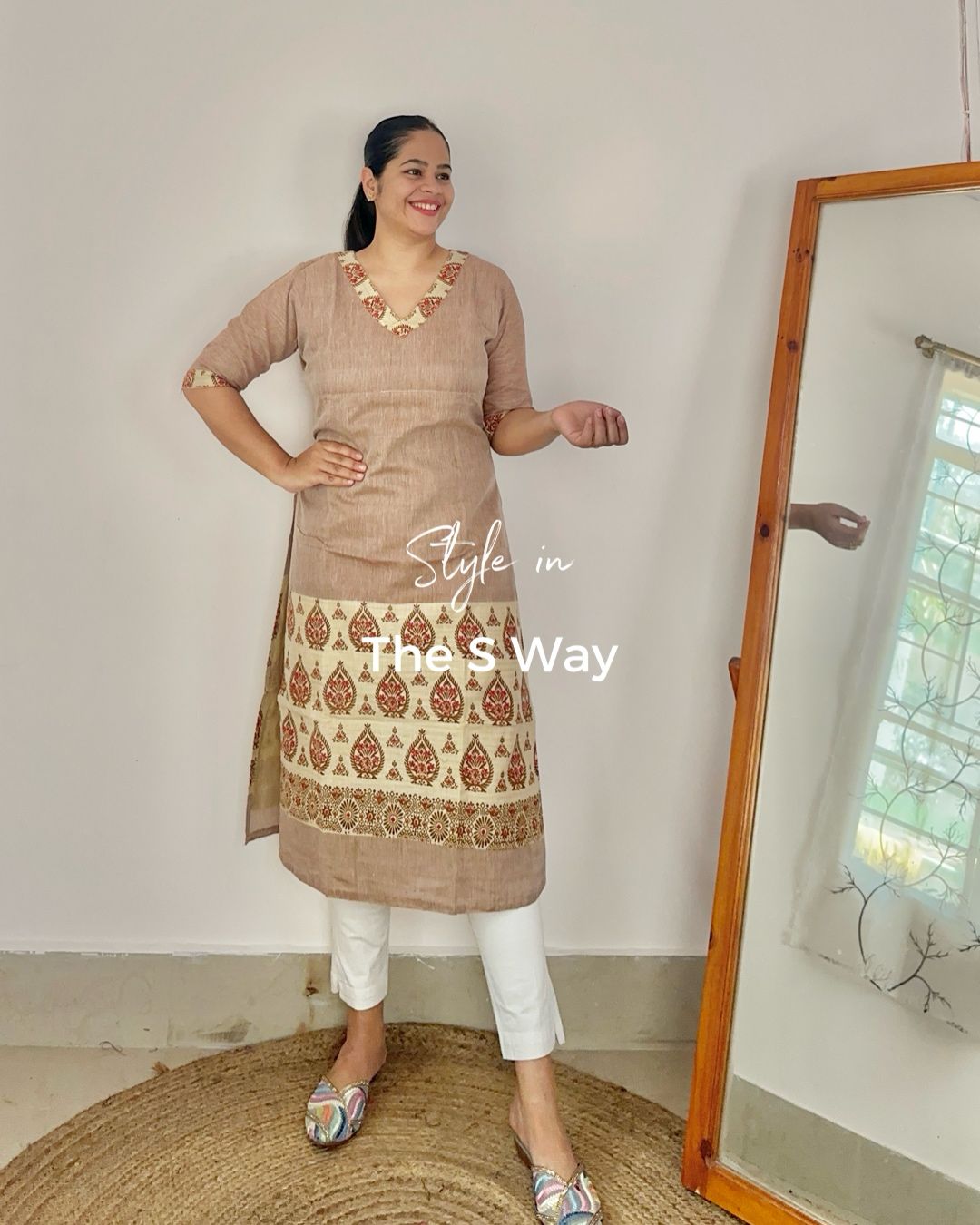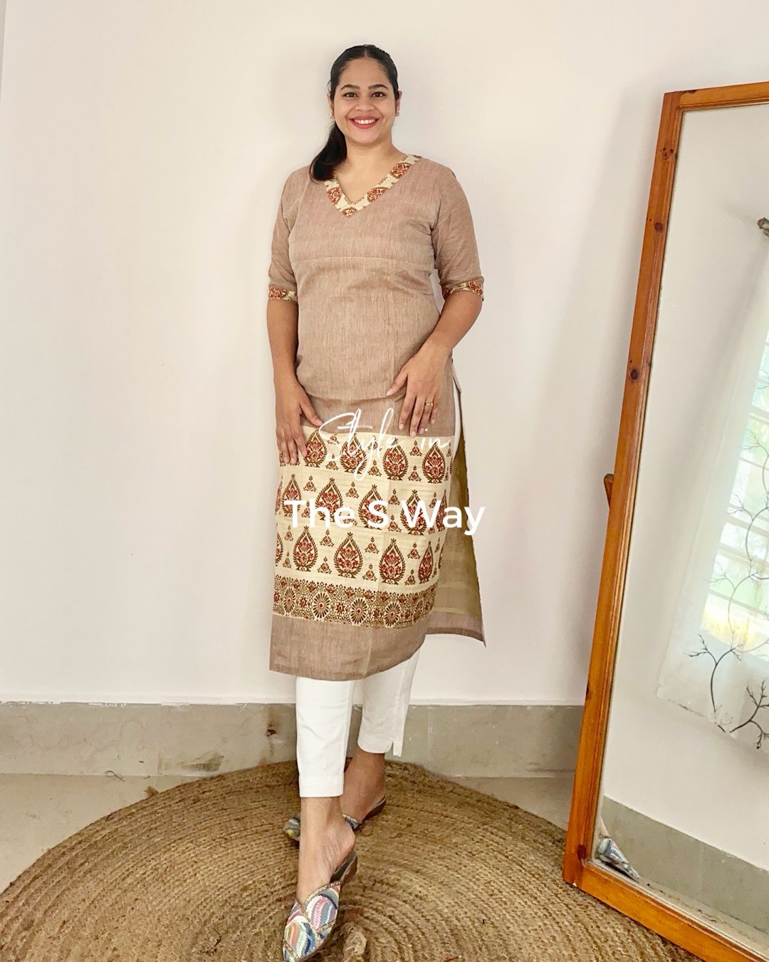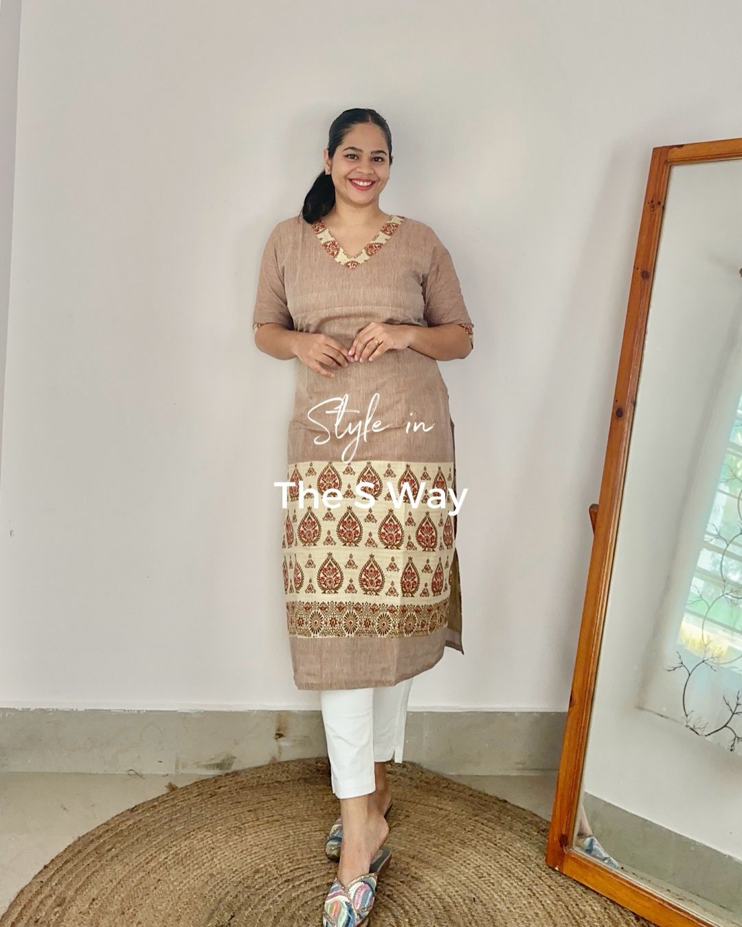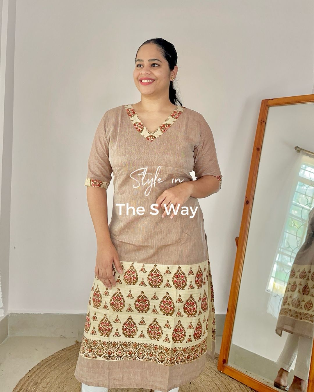 Khadi cotton printed kurta, lightweight and comfortable. Features regional Hinghkap print at the bottom in a rich earthy brown hue.